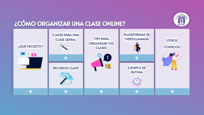 A continuación os dejamos una presentación interactiva con distintos recursos y consejos para ayudar a organizar una clase online. Para acceder a las distintas secciones tenéis que pulsar en los símbolos (+), no dudéis en investigar cada parte de la presentación, hay información esperándoos. ¡Esperemos que os sea de ayuda!